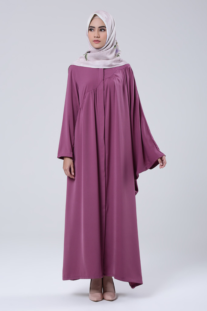Dalam nuansa warna bright dan material polos, dress untuk haji dan umroh yang satu ini memiliki potongan loose yang sangat nyaman. Yang membuatnya unik adalah potongan asimetris pada bagian depannya.