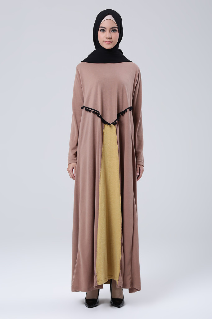 Dengan nuansa warna earth tone, dress yang satu ini juga bisa menajdi salah satu pilihan untuk teman saat beribadah haji dan umroh. Yang membuatnya unik adalah aksen pom-pom pada bagian depan.
