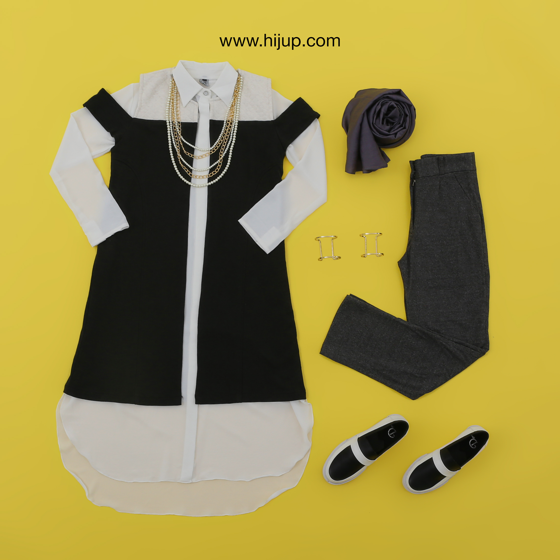Tunik modern sudah pasti menjadi alternatif lain ketika para wanita karir bosan menggunakan kemeja sebagai busana kantor. Padukanlah tunik modern dengan vest bernuansa hitam putih agar tampilmu tampak profesional. Gabungkan dengan celana serta jilbab berwarna senada yang netral seperti abu-abu. Tambahkan kalung berwarna gold untuk memberikan kesan yang lebih elegan.