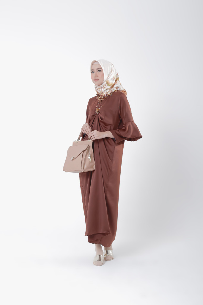 Untuk gaya pesta dimalam hari kamu bisa mencoba tampilan yang elegant and glamour. Kamu dapat mencoba kaftan bernuansa cokelat yang memiliki aksen beads pada bagian leher. Yang membuat kaftan ini unik adalah aksen pola lengan terompet. Kunci agar tampilanmu stylish adalah dengan menambahkan hand bag, jilbab segi empat motif, serta sandal bernuansa gold.
