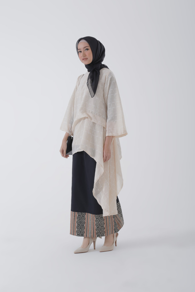 Tak sulit untuk terlihat dewasa saat sedang menghadiri pesta pernikahan. Kamu bisa mengenakan bawahan berupa kain yang memiliki material seperti tenun yang dipadukan dengan atasan polos yang memiliki potongan unik. Pilihlah atasan berbentuk asimetris dengan pola drapery untuk menambah kesan formal. Meski simple, namun rok yang kamu kenakan sudah memiliki statement tersendiri pada penampilanmu. Tambahkan jilbab polos yang senada dengan rok serta sepatu yang senada dengan atasan yang kamu kenakan.
