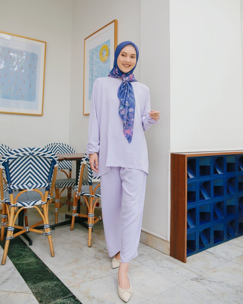 Walaupun tidak memiliki memiliki motif seperti inspirasi yang sebelumnya, one-set yang berwarna pastel lilac ini tetap menarik untuk dilihat bukan?
