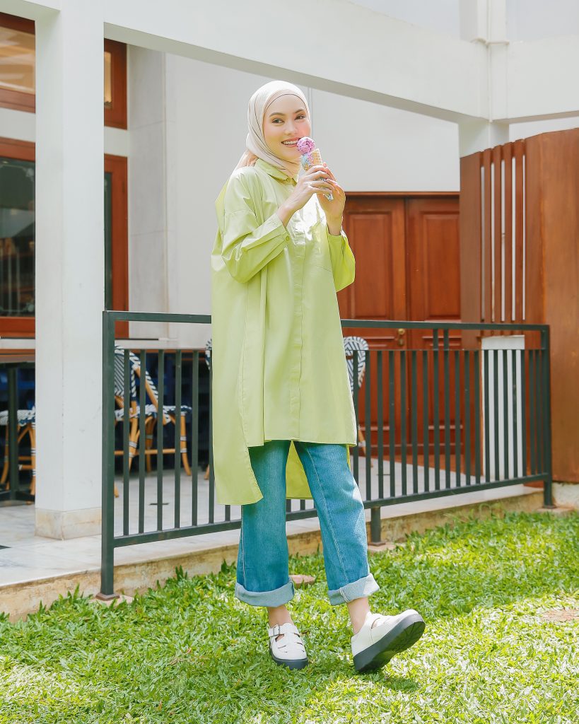 Apalagi, outfit yang satu ini di padukan dengan top berwarna lemon green yang pastinya bisa membuat penampilanmu terlihat fresh dan juga youthful, lho. Nah, kalau kamu mau tampil lebih sempurna, kamu bisa pakai denim pants yang dominan berwarna biru muda, ya.