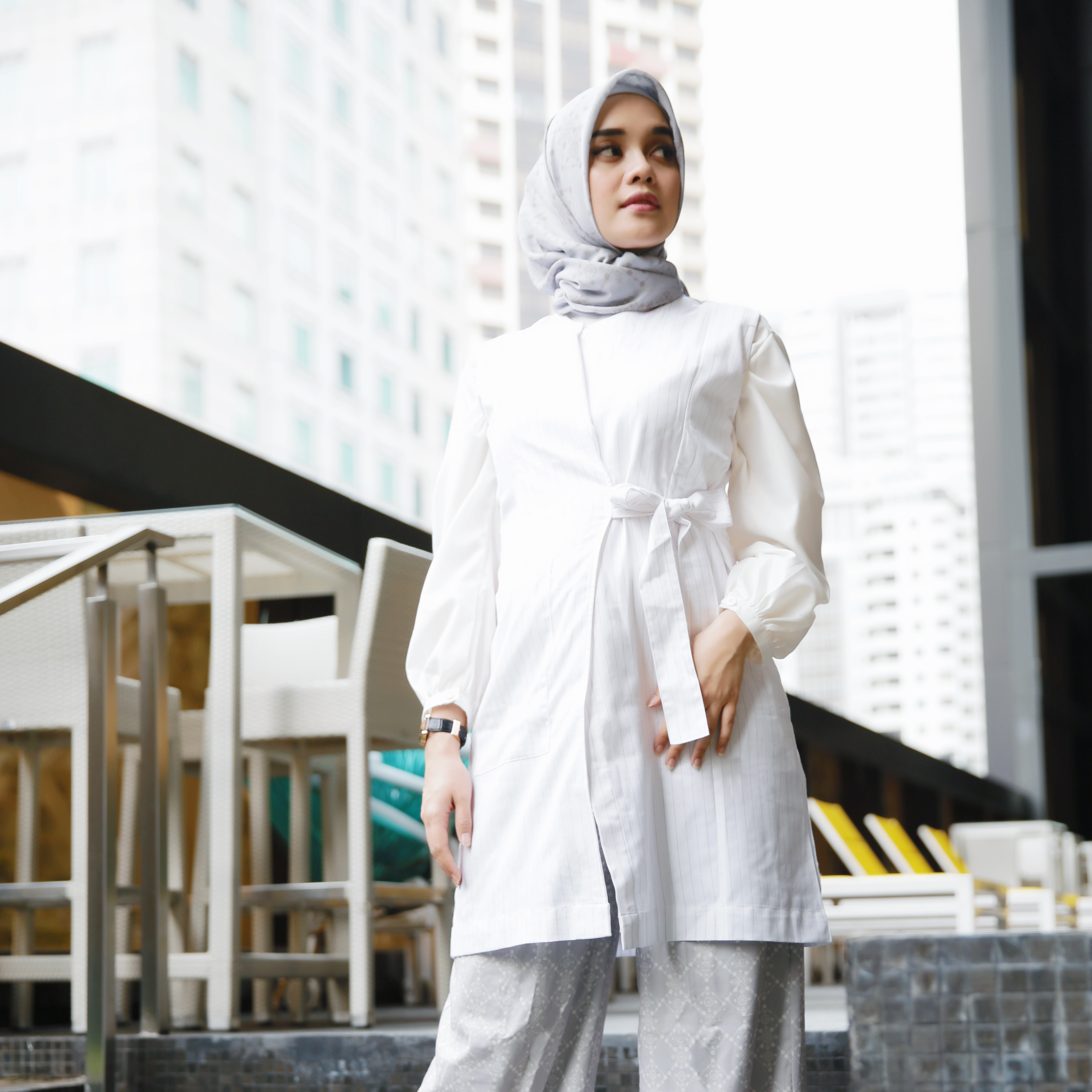 Memadupadankan sesama warna netral pada jilbab dan baju seperti putih, abu-abu, hitam, krem ataupun coklat muda, membuatmu terlihat elegan dam mempesona di berbagai suasana. Jangan ragu untuk memilih warna-warna netral untuk gaya liburanmu, karena warna-warna ini akan memberikan kesan cerah untuk wajahmu sehingga hasil foto liburanmu akan semakin cantik. Padukan atasan, outerwear dan bawahan dengan warna yang senada, lalu padukan dengan jilbab bermotif abstrak.