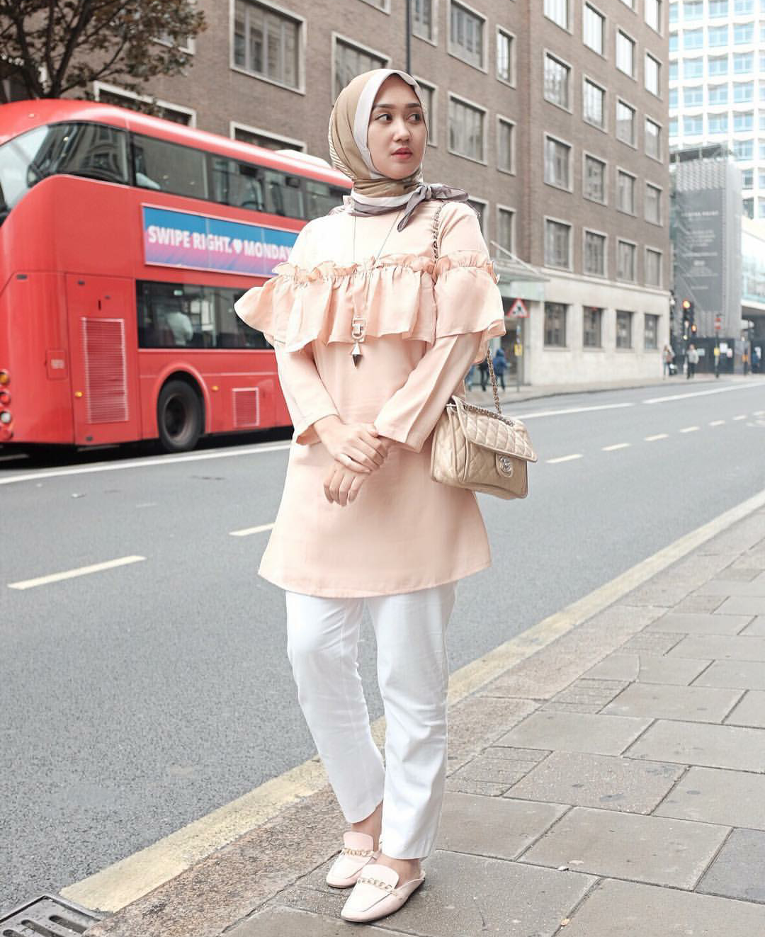 Atasan dengan aksen ruffle memang dapat membuat penampilanmu tampak classy dan feminin. Model atasan ruffle ini memang sedang kembali menjadi tren dengan berbagai model aksen di bagian dada, lengan, bahu, atau pinggul. Kamu bisa memadupadankan atasan ruffle dengan capri pants atau palazzo agar lebih santai. Terakhir, padukan dengan loafer shoes agar kakimu ringan melangkah saat jalan-jalan di tengah kota tujuan liburanmu.