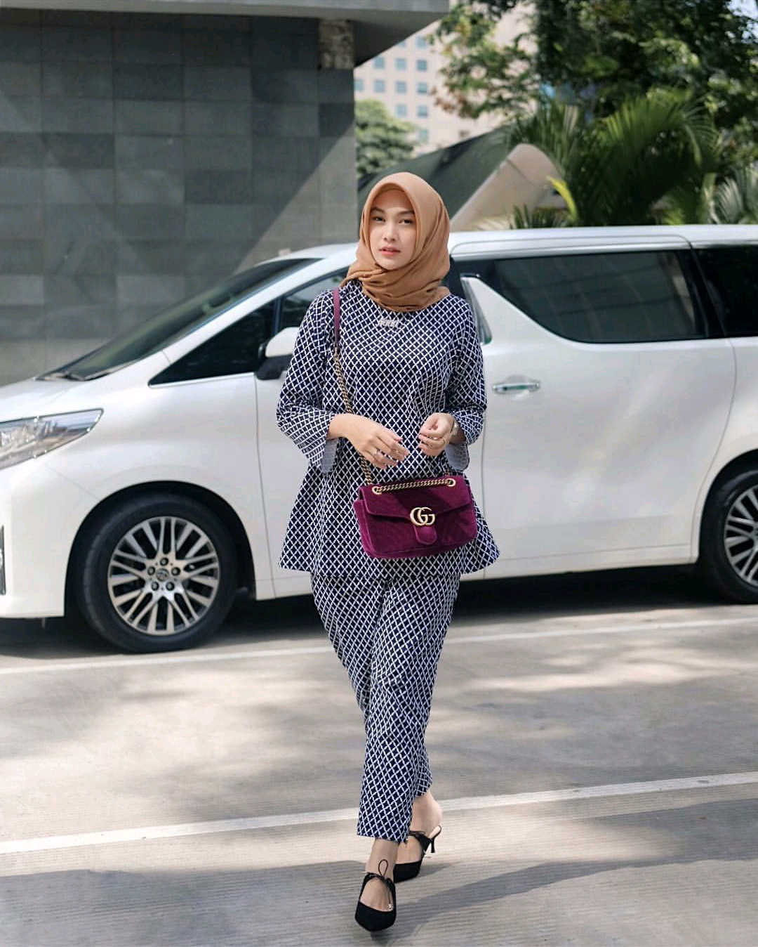 Padu padan patterned suit dengan kitten heels dapat membuat tampilan feminin yang mengesankan. Lengkapi dengan jilbab berwarna nude dan sling bag yang semakin memberikan sentuhan girly.