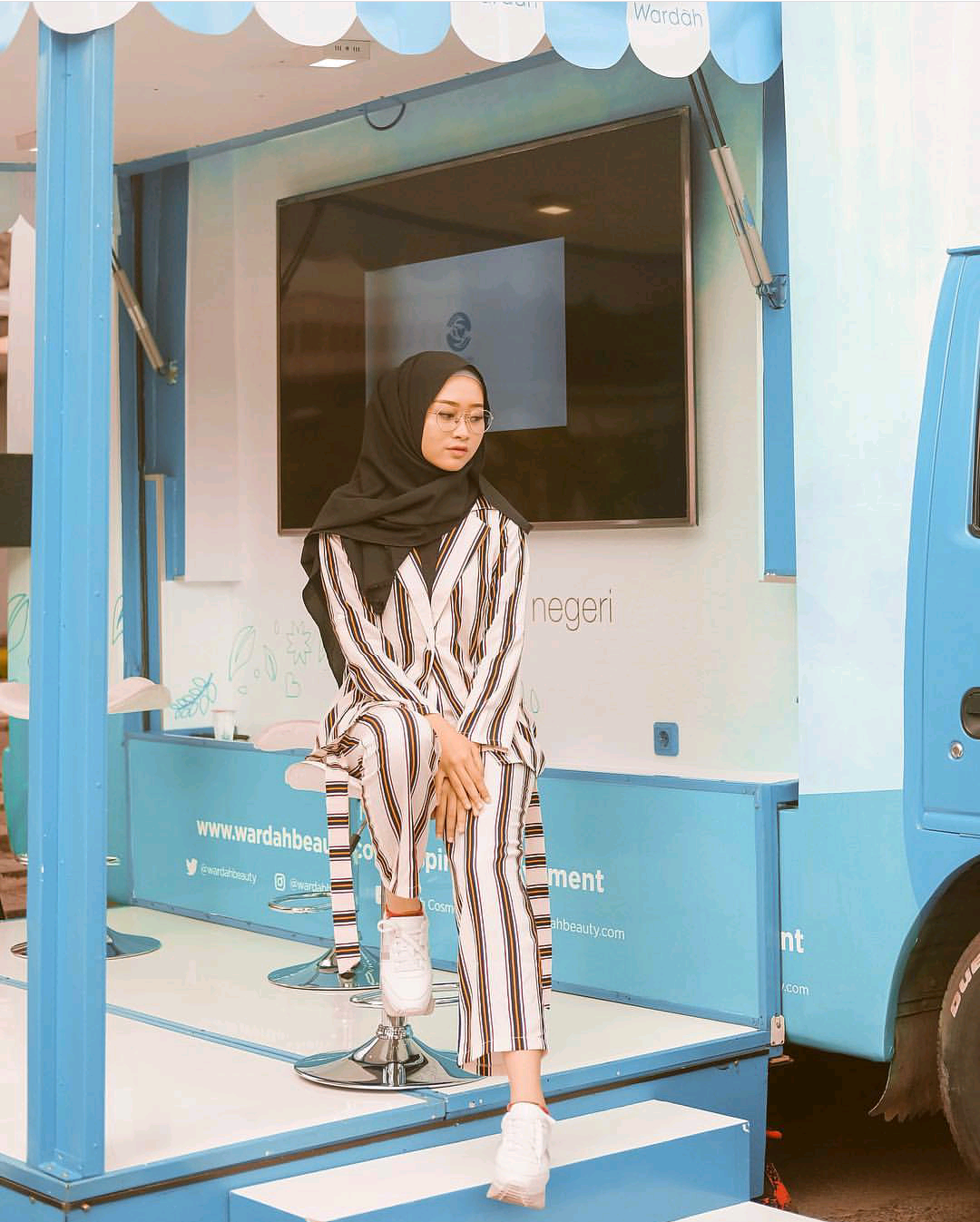 Tampil sporty dengan setelan ke kantor? Why not! Padu padan blazer dan celana bermotif garis-garis ini cocok sekali dilengkapi dengan sneakers berwarna putih yang trendi.