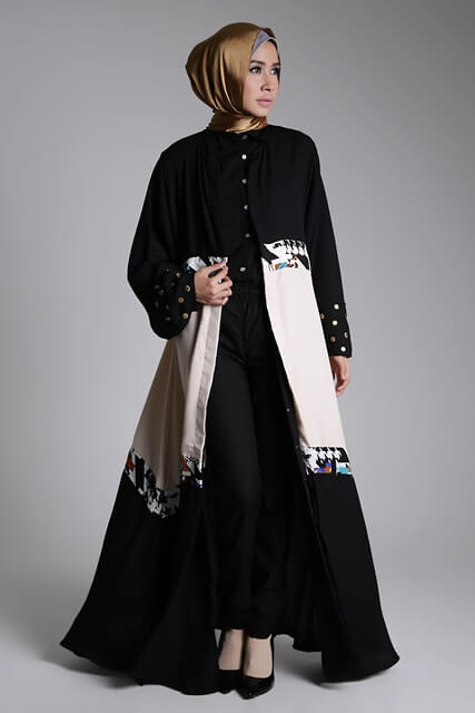 Busana muslim untuk pesta kali ini dikombinasi dengan aksen 2 ornamen, yakni motif dan beads. Beads berwarna gold memberikan kesan mewah dan diseimbangkan dengan motif geometris yang digunakan sebagai aksen dan memberikan kesan dinamis. Abaya dengan kancing depan ini cocok digunakan pada acara pesta di siang atau sore hari.