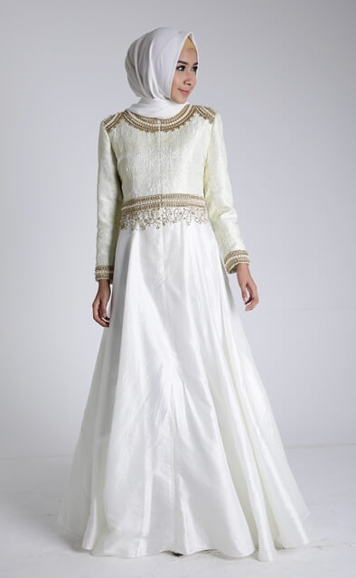 Didominasi nuansa pearl white, dress yang menggunakan bahan dasar tenun yang memberikan kesan etnik namun sangat modern dan glamor. Busana muslim untuk pesta ini dipadukan dengan detail beads berwarna gold dan pearl yang mengelilingi bagian pinggang, bahu, serta leher. Pearlia Dress sangat cocok digunakan untuk acara pesta di malam hari.