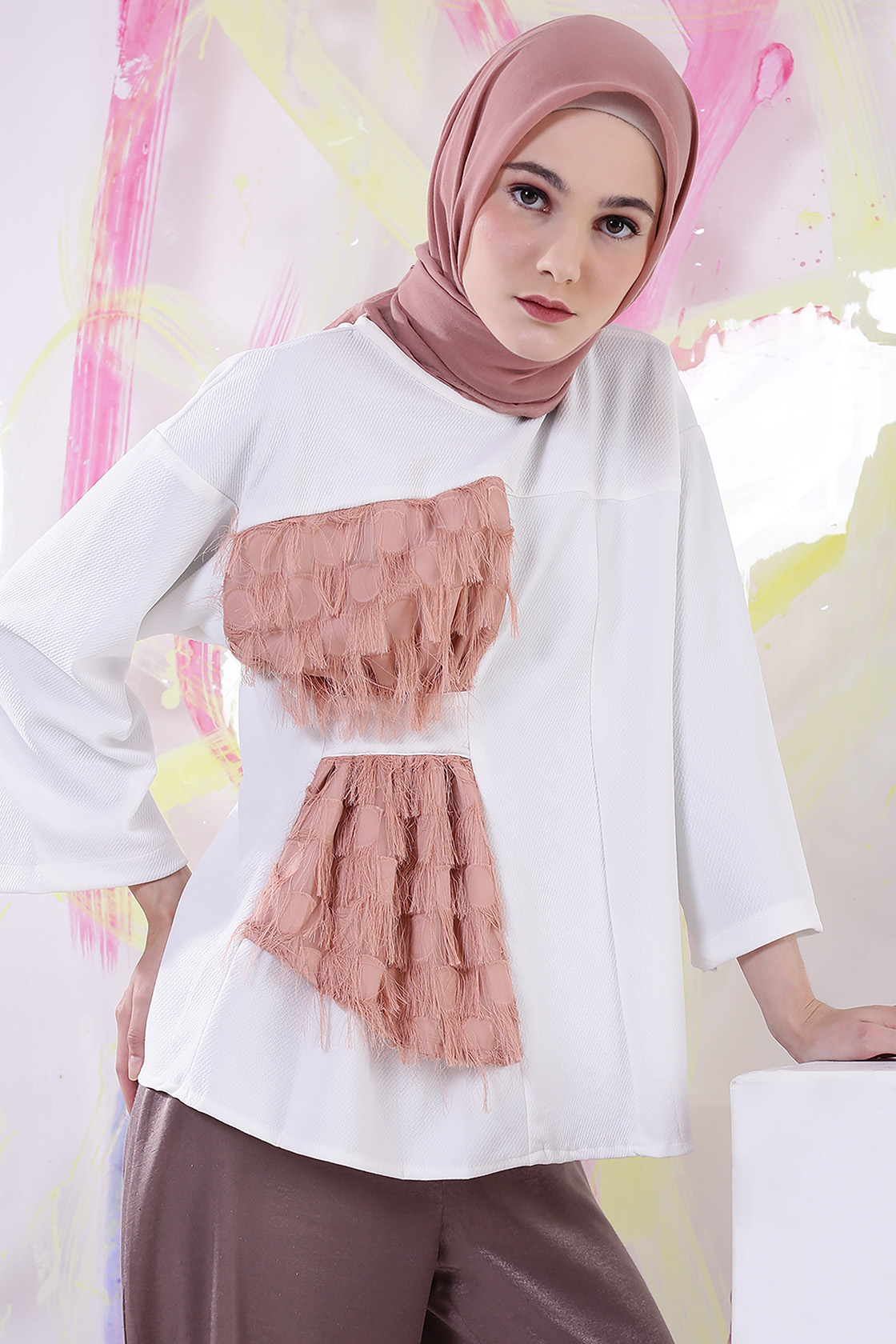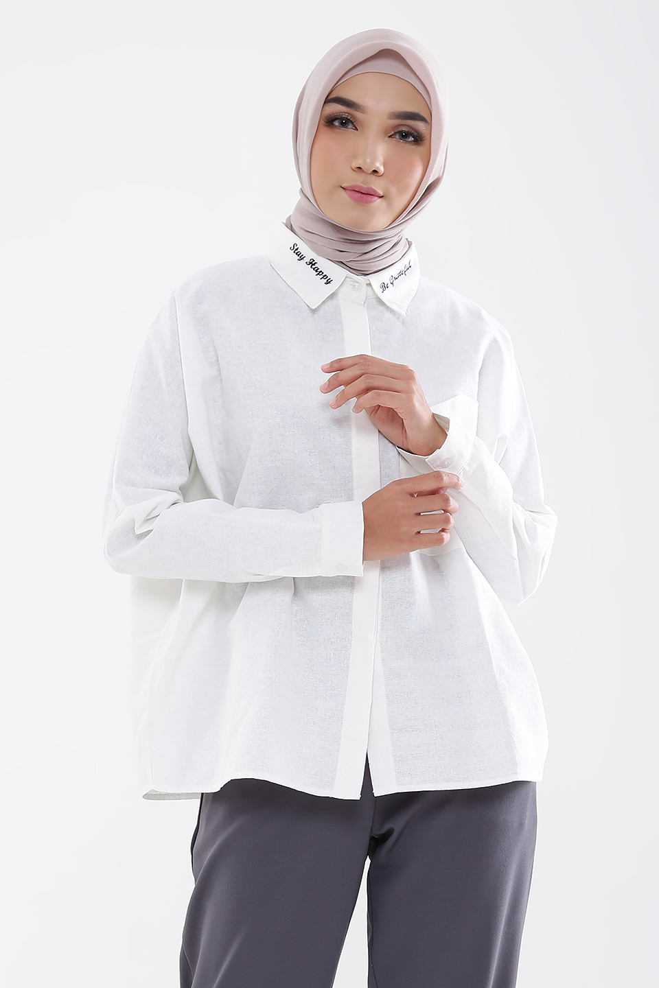 Blus putih bisa tampil lebih feminin dan stand out dengan detail pita besar di bagain pinggang. Cukup padukan dengan jilbab berwarna senada agar blus putihmu menjadi statement dari tampilanmu.