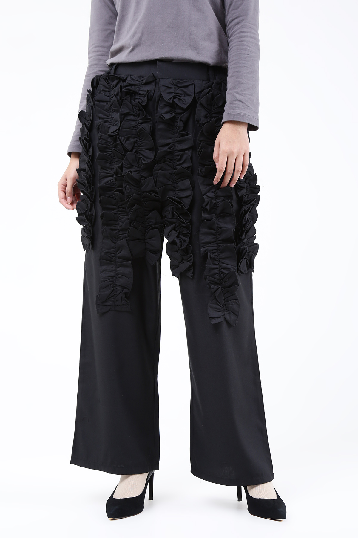 Siapa bilang celana hitam tidak bisa jadi fashion statement? Celana panjang dengan aplikasi ruffle senada yang terlihat unik untuk tampilan ke kantor yang penuh twist!