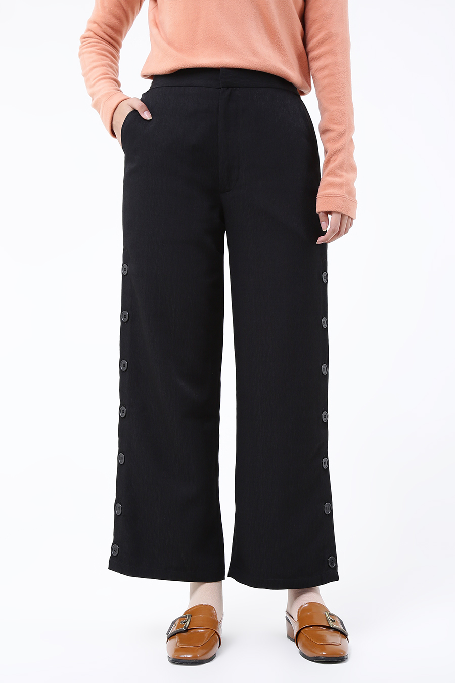 Celana panjang berdesain simpel dengan aksen kancing depan. Basic essential is always better!