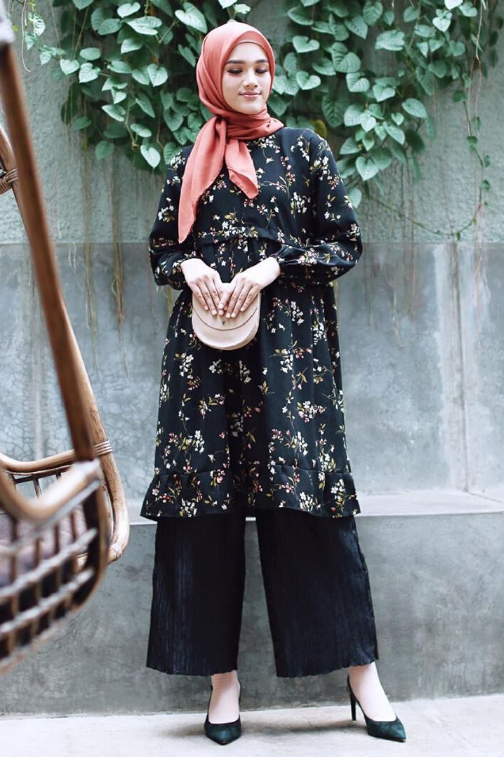 Takut terlihat monoton? Kamu bisa memasangkan tunik motif bunga dengan celana kulot plisket dan hijab berwarna terang. Lengkapi gaya yang satu ini dengan koleksi hand bag dan high heels.