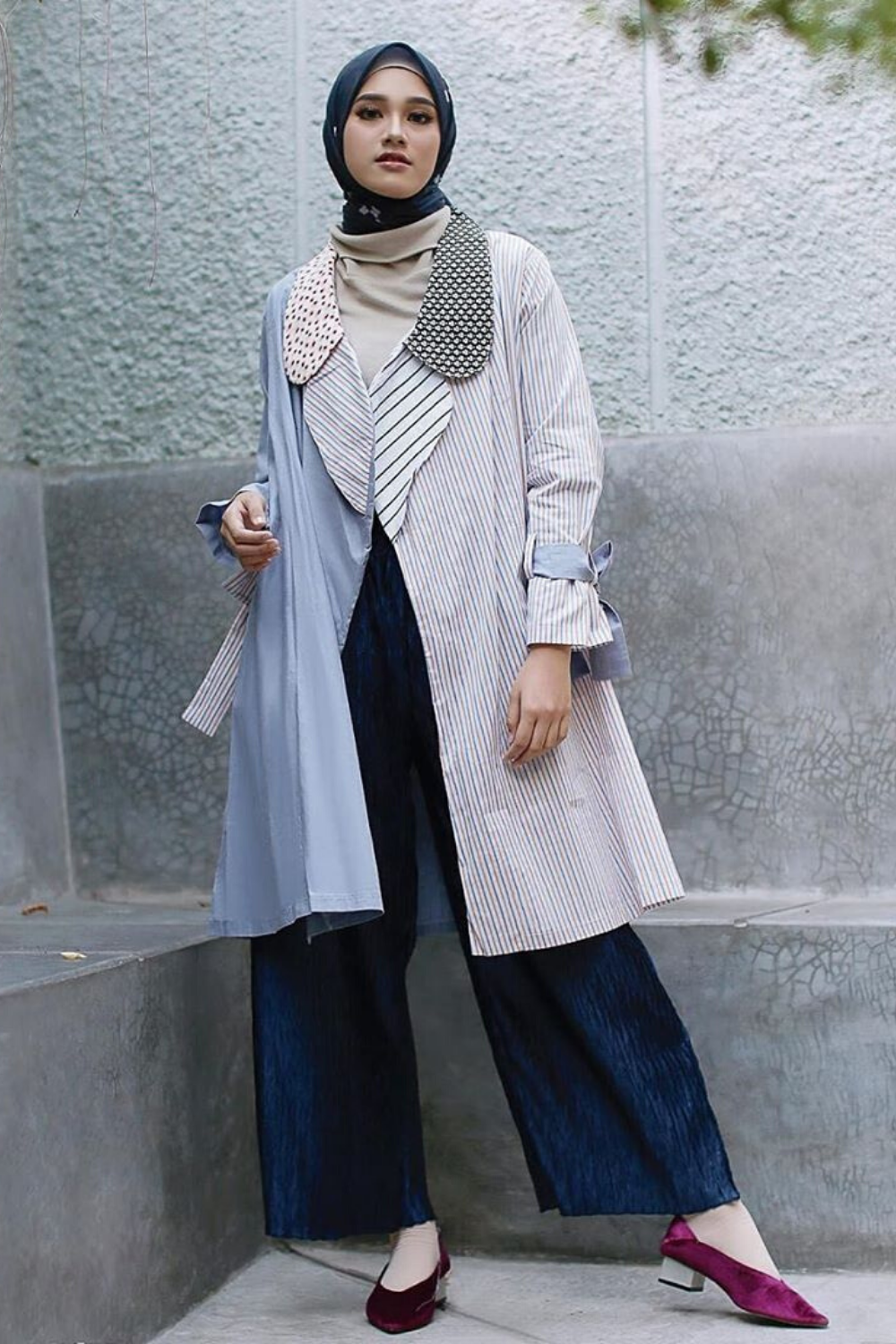 Kurang percaya diri menggunakan celana kulot karena pinggulmu yang besar? Kamu bisa menyiasatinya dengan menyematkan koleksi long outer seperti ini. Koleksi outer ini akan menutupi bagian pinggul yang besar dan mampu menghadirkan efek jenjang.