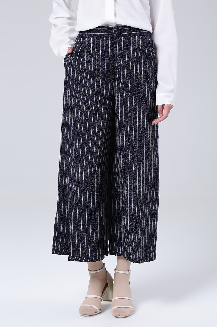 Celana kulot dengan motif garis-garis vertikal atau striped pants merupakan salah satu fashion item yang wajib kamu miliki. Kamu dapat memadupadankannya dengan atasan seperti blus atau tunik berwarna netral seperti hitam, putih atau abu-abu, dan jilbab segi empat polos untuk memberikan kesan simple chic seperti gaya para aktris Korea. Selain itu, striped pants juga dapat memberikan efek jenjang pada kakimu.