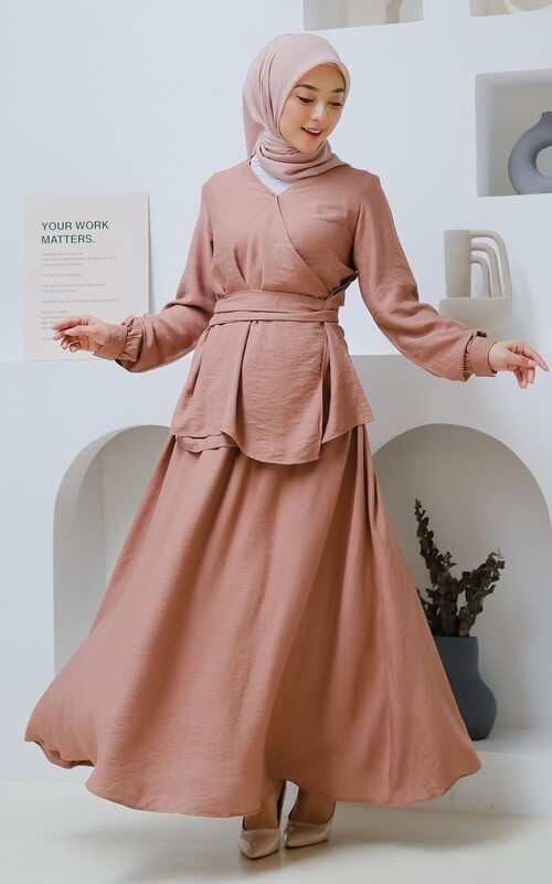 Setelan ini menggunakan model atasan blouse yang dilengkapi dengan belt kecil di bagian pinggangnya. Belt tersebut dapat membantu membentuk pinggang yang lebih ramping. Di bagian tangannya menggunakan model karet kerut sehingga lebih mudah disingkap saat kamu berwudu.