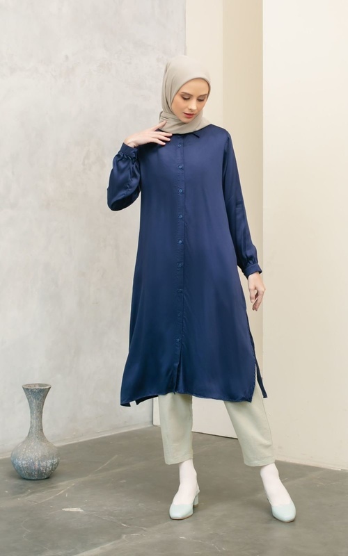 Intinya, tunik panjang yang satu ini pasti akan pas sekali untuk kamu yang mencari tampilan simpel elegan! Terlebih warna biru navy ini terkenal cocok dengan berbagai sandingan warna yang lain karena kenetralannya.