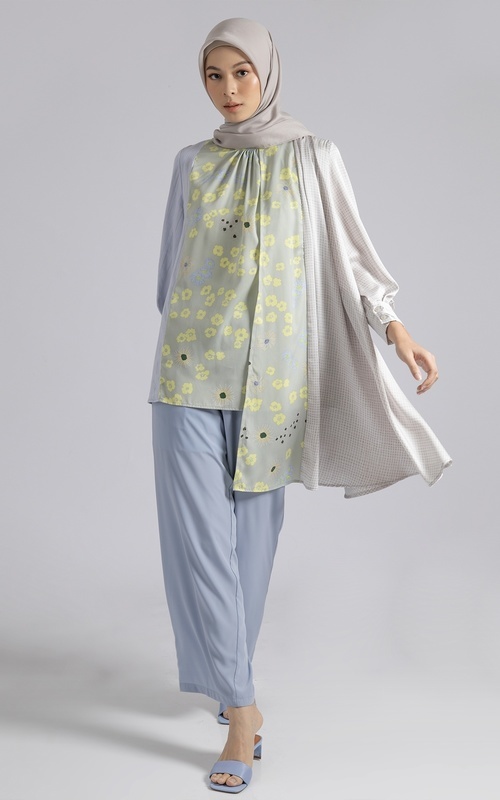 Pilihan tunik wanita kekinian yang satu ini menonjolkan sisi unik bentuknya yang cantik sekali dengan dua layer yang berbeda. Dengan dasaran baju berwarna silver abu, bagian tengah baju ini diisi oleh motif bunga berwarna kuning yang menampilkan kuat kesan aesthetic.