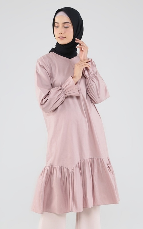 Tunik ini sangat simpel karena tidak memiliki motif sama sekali. Yang membuatnya terlihat cantik dan kekinian adalah ruffle di ujung bajunya, dan juga kerutan di tangannya.