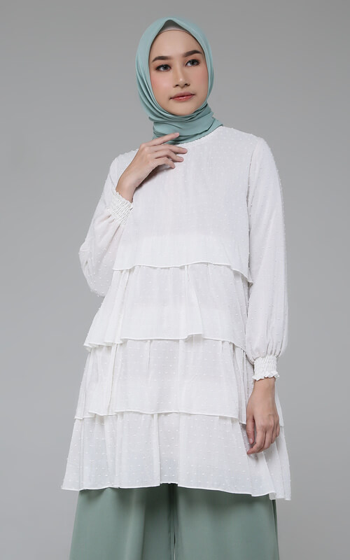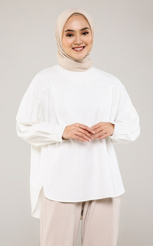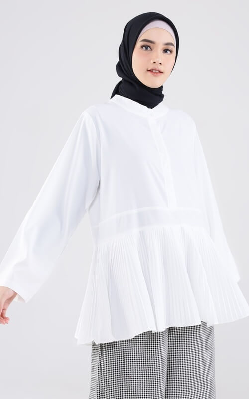 Jika ingin tampilan feminim dan cute, kamu bisa pasangkan blouse putih polos dengan rok dan hijab warna baby pink. Blouse ini memiliki detail kancing di bagian depan dan lengan, serta sedikit jahitan plisket di bagian bawah perut.