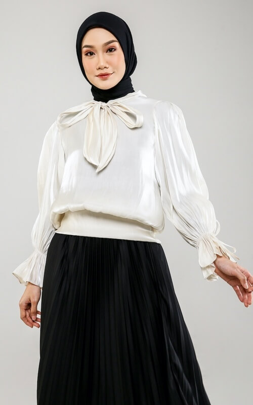 Blouse warna broken white dengan kerah pita besar seperti ini cocok dipadukan dengan rok jika kamu ingin menciptakan kesan anggun sekaligus feminim.