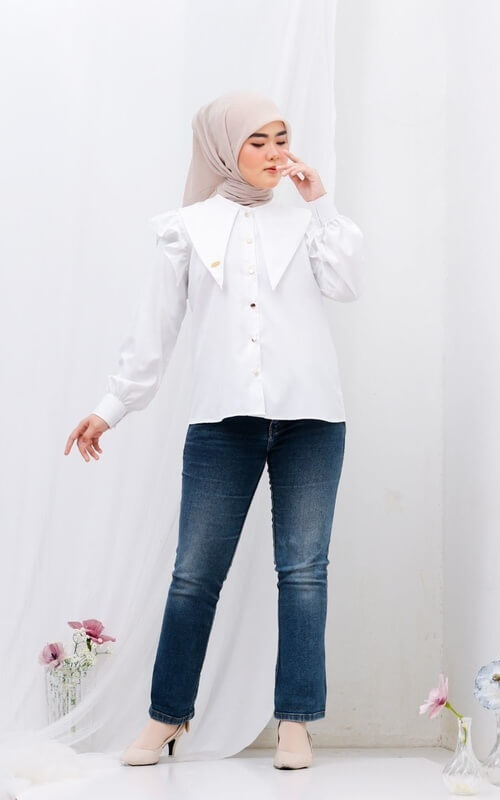 Ingin tampil lebih boyis tapi tetap sopan dan cocok untuk acara semi-formal? Maka kamu bisa coba blouse putih berkerah dengan celana jeans biru tua. Blouse ini tampak kece dengan kerah rebah lancip yang memanjang ke bawah dan membentuk siluet seperti huruf V.