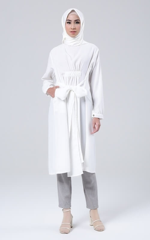 Tak harus pakai long dress, kamu bisa jadikan tunik panjang warna putih untuk outfit lebaran. Tunik dengan bahan ringan ini punya panjang sampai lutut dengan aksen pita di bagian tengah perut. Tepat di atas pita ada aksen kerut yang membuat tubuh terlihat lebih ramping.