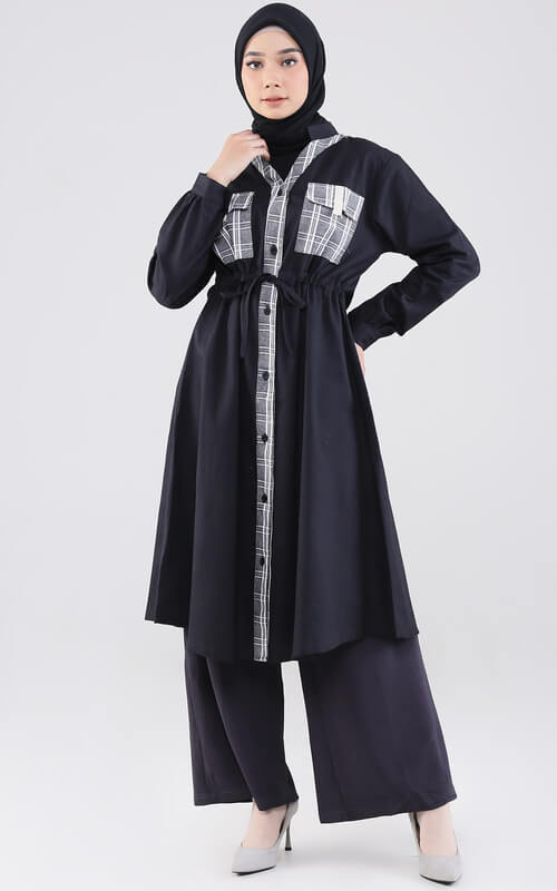Cari model baju tunik yang simple tapi fashionable serta netral? Ada dong. Kamu bisa jatuhkan pilihan pada long tunik warna hitam berikut ini. Meski berwarna basic dan classic, tapi tunik ini tetap terkesan modis dengan kombinasi motif kotak di beberapa bagian termasuk saku.