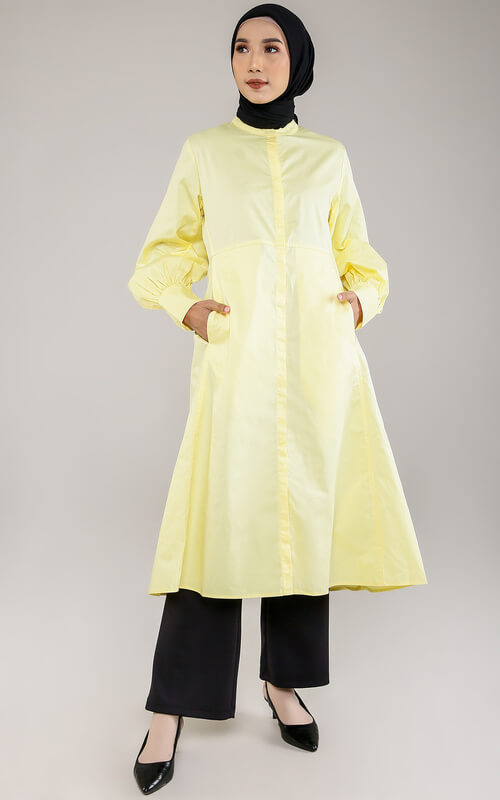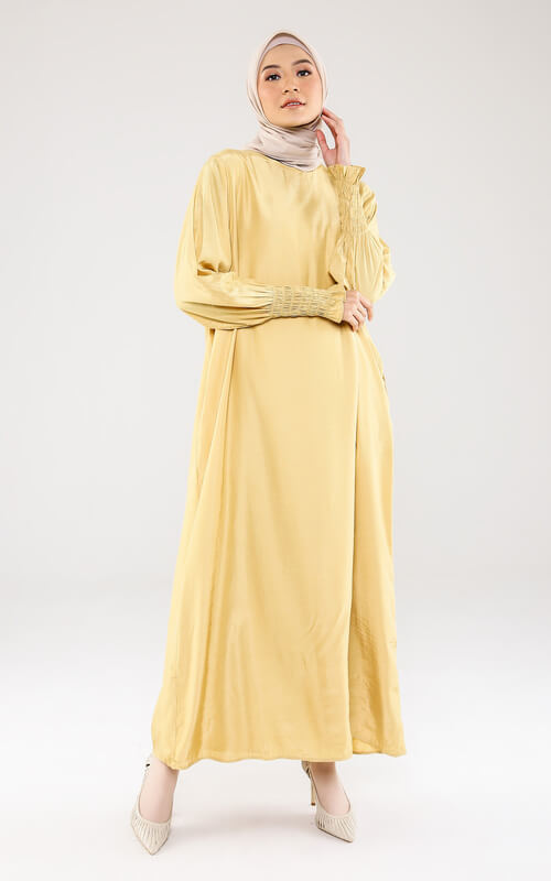 Ingin baju kuning saat lebaran atau acara pengajian? Maka kamu bisa meminang dress berwarna kuning keemasan seperti foto di atas. Meski polos, dresss ini tetap tampak stylish berkat aksen kerut di bagian ujung lengan, yang juga akan membuat kamu lebih mudah saat akan berwudhu.