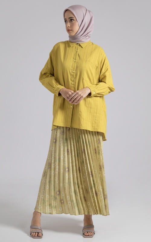 Siapa nih yang pernah mengikuti trend rok plisket yang sempat sangat hype beberapa waktu silam? Daripada rok cantik ini hanya berdiam diri di dalam lemari pakaian, kamu bisa keluarkan untuk dijadikan pasangan kemeja kuning motif garis seperti foto di atas.