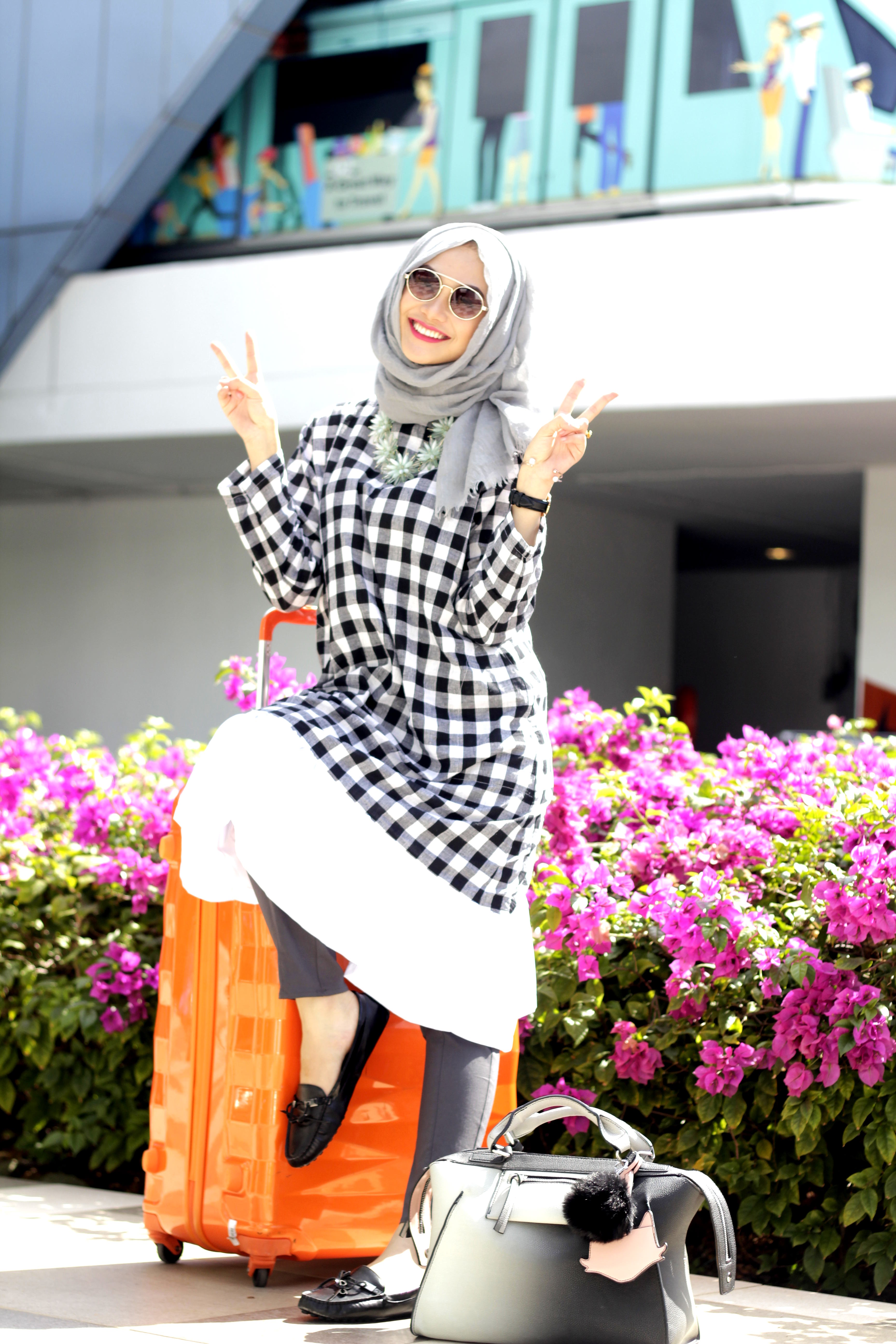 Indah Nada memilih airport style yang terdiri dari long top dan pencil pants. Nada mengaku pemilihan atasan yang loose ini sangat nyaman untuk bergerak. Dengan ukuran yang panjang membuat atasan ini terlihat sopan. Motif gingham hitam putih pada atasan ini juga memberikan kesan netral yang tak berlebihan. Warna netral seperti ini memungkinkan kita untuk memadupadankan dengan berbagai warna, seperti kalung berwarna mint green berbentuk bunga yang dipakai oleh Indah Nada di atas.