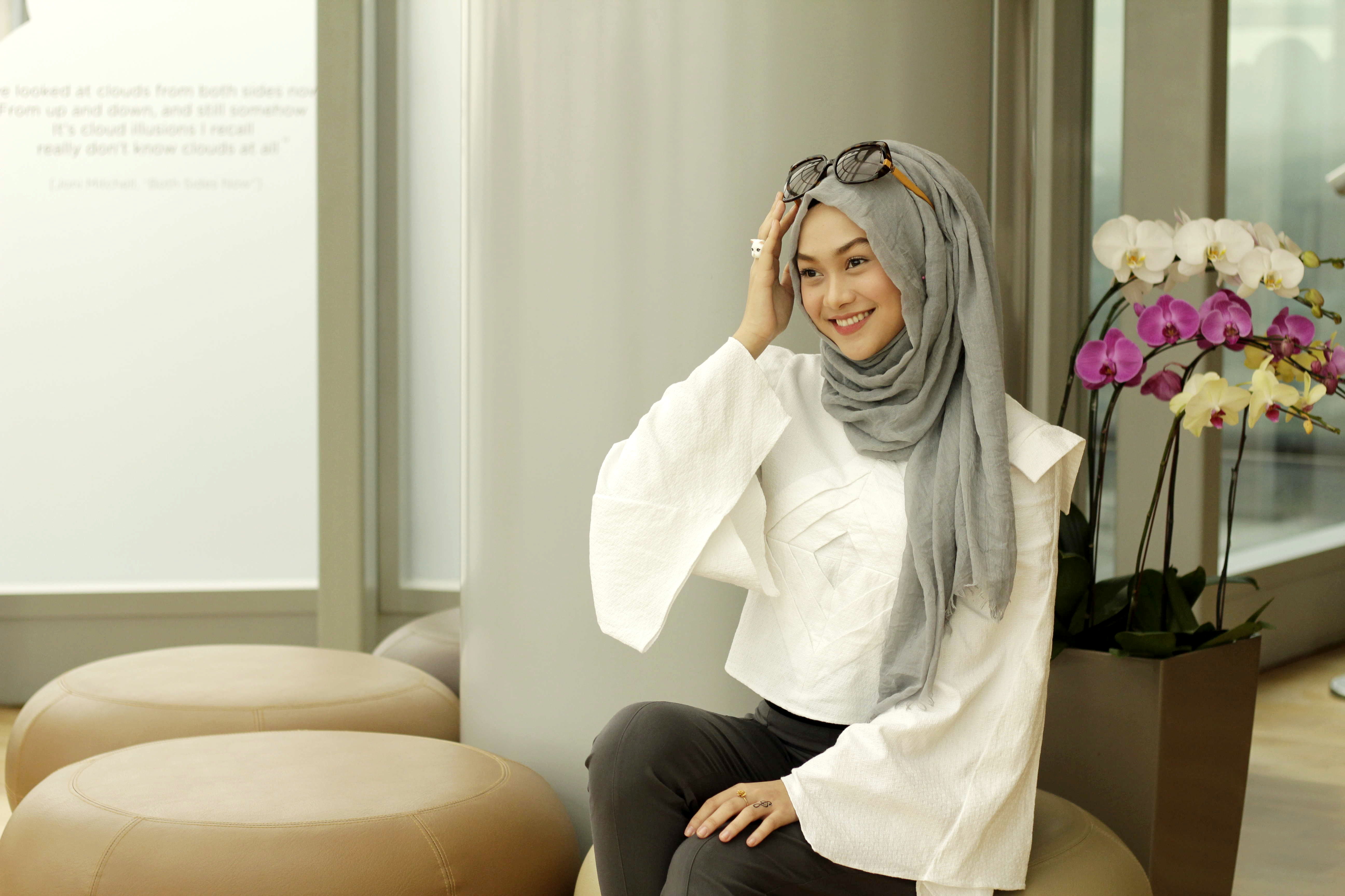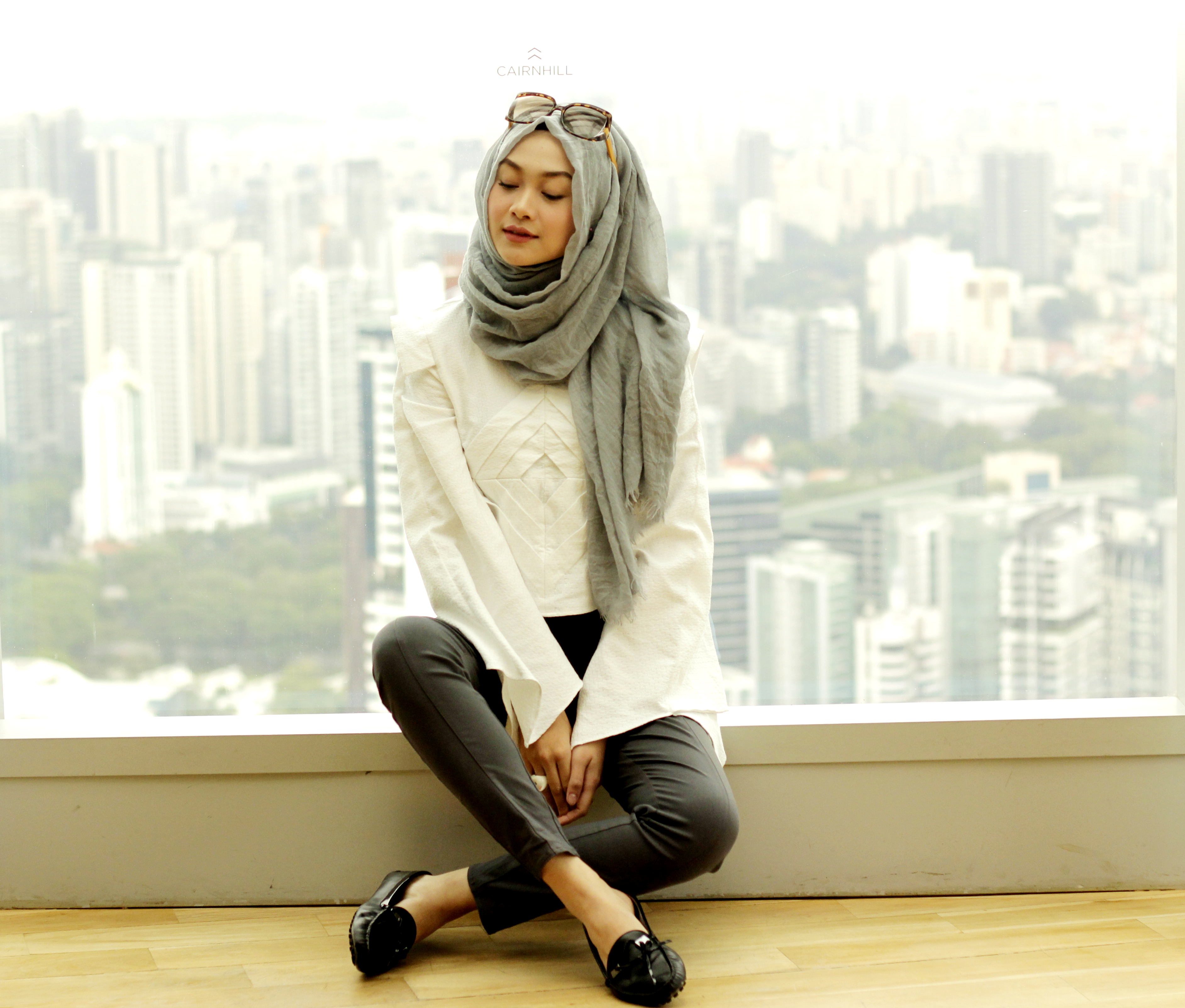 Busana tersebut ia padankan dengan flat shoes berwarna hitam denganĀ sedikit aksen fringe. Sepatu seperti ini membuatnya bisa nyaman berjalan sekaligus tetap memberikan statement tersendiri. Hijab yang ia pilih adalah pashmina berbahan viscose. Selain karena material yang tak mudah kusut, material viscose ini pun mudah dibentuk dan menyerap keringat. Gaya hijabnya sangat casual, dan tak berlebihan. (Intip tutorial hijab casual dari pashmina berbahan viscose di sini)