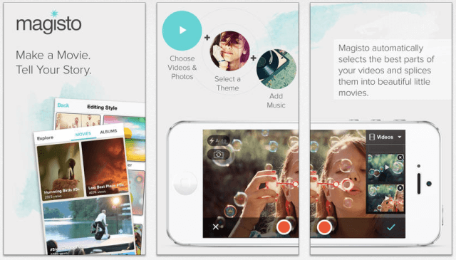 Magisto merupakan aplikasi yang cukup populer baik di Android maupun IOS. Aplikasi ini dapat membuat rentetan foto menjadi video yang apik. Selain itu video kamu juga dapat diedit dengan berbagai pilihan tema yang ada. Aplikasi ini dapat secara otomatis mengatur kontras warna, exposure, hingga saturation. Kamu juga dapat menambahkan musik untuk semakin mempercantik editan videomu.