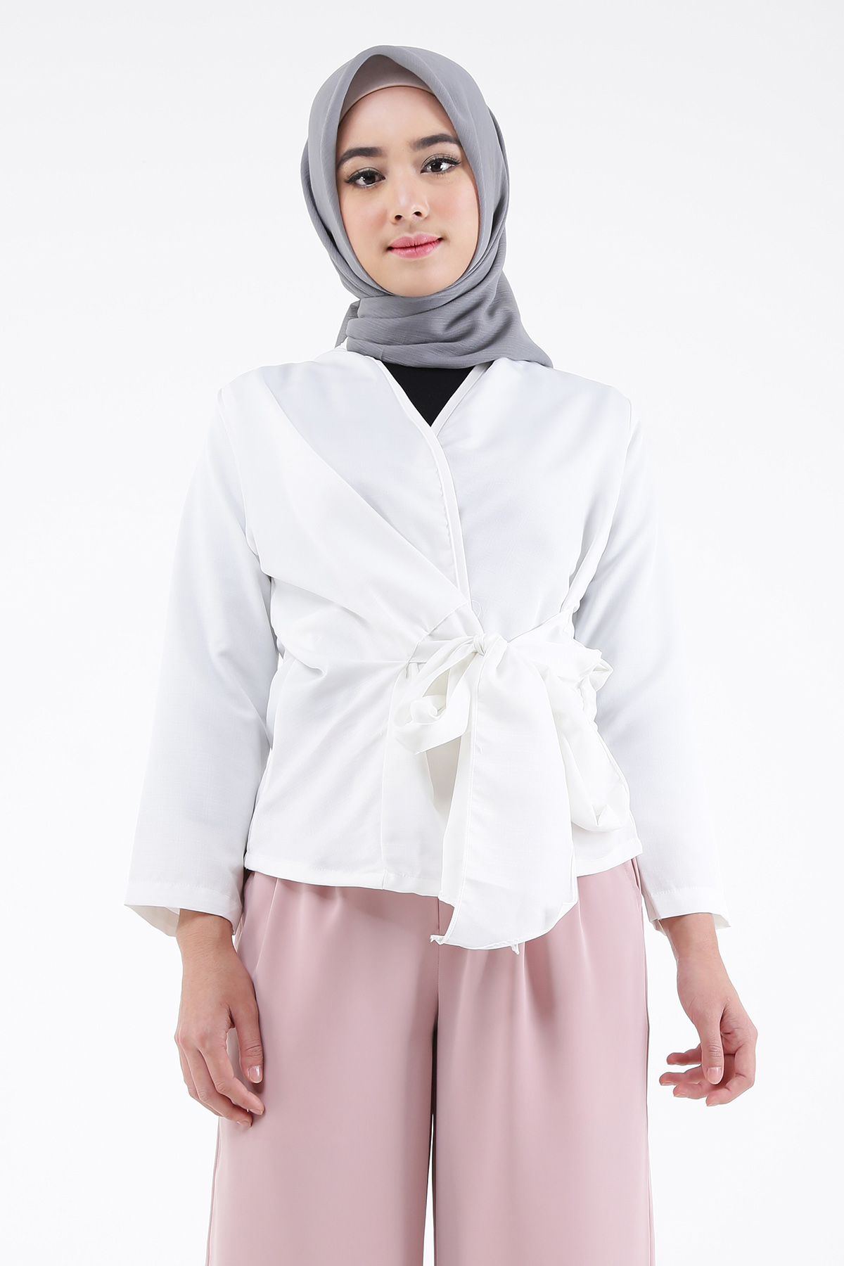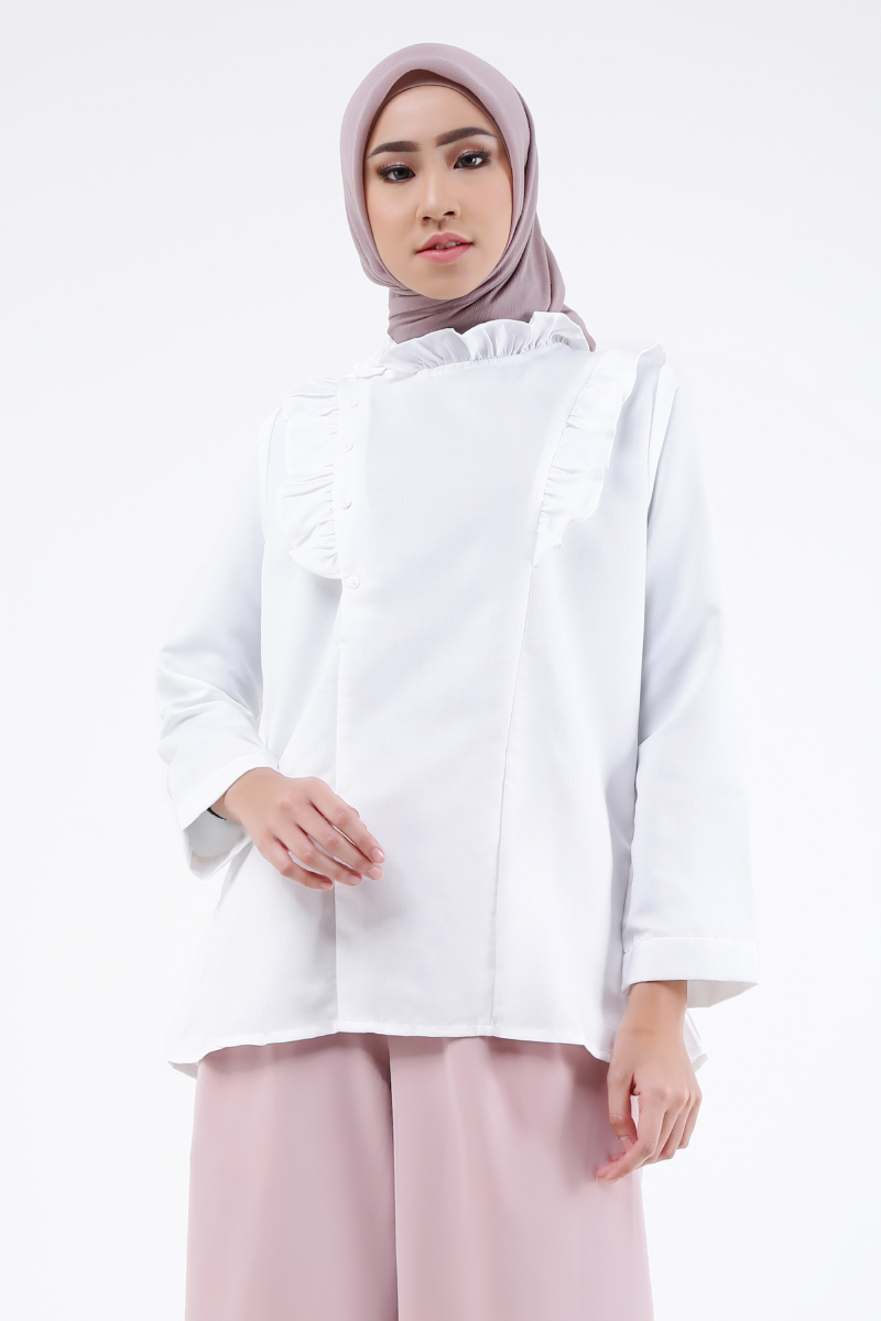 Atasan putih wanita dengan ruffle berpola silang di bagian perut ini cocok untuk kamu padankan dengan rok A Line polos berwarna gelap yang cantik. Lengkapi tampilanmu dengan jilbab motif yang lembut.
