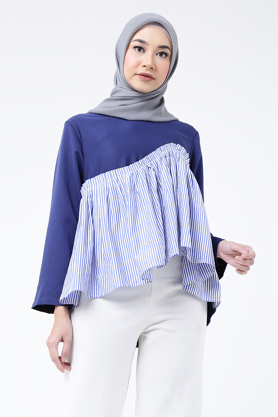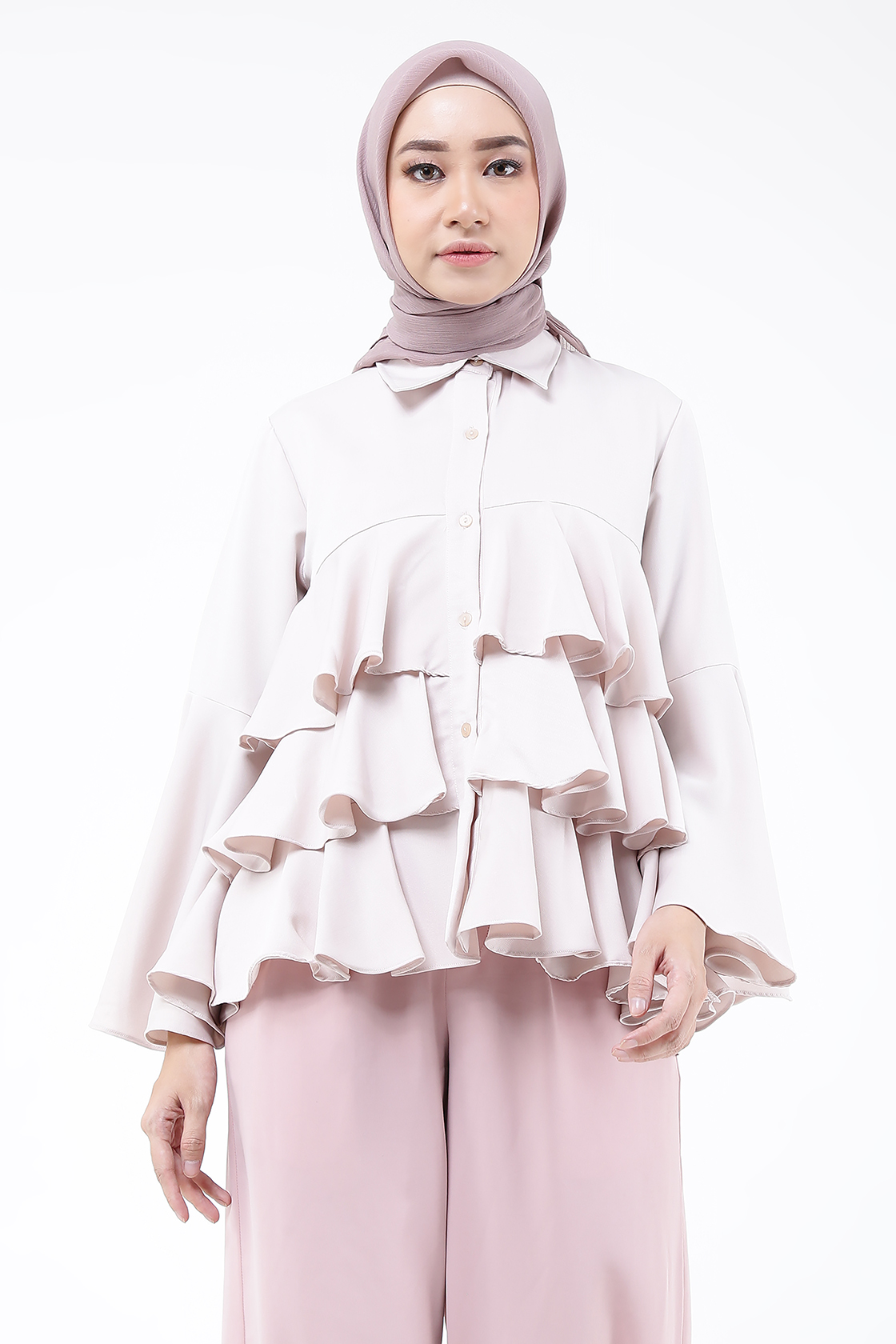 Aksen ruffle pada bagian ujung lengan, baju, dan dada memberikan kesan mewah pada tampilanmu. Padukan dengan rok berpotongan A atau celana kulot polos berwarna nude untuk tampilan girly yang fashionable.