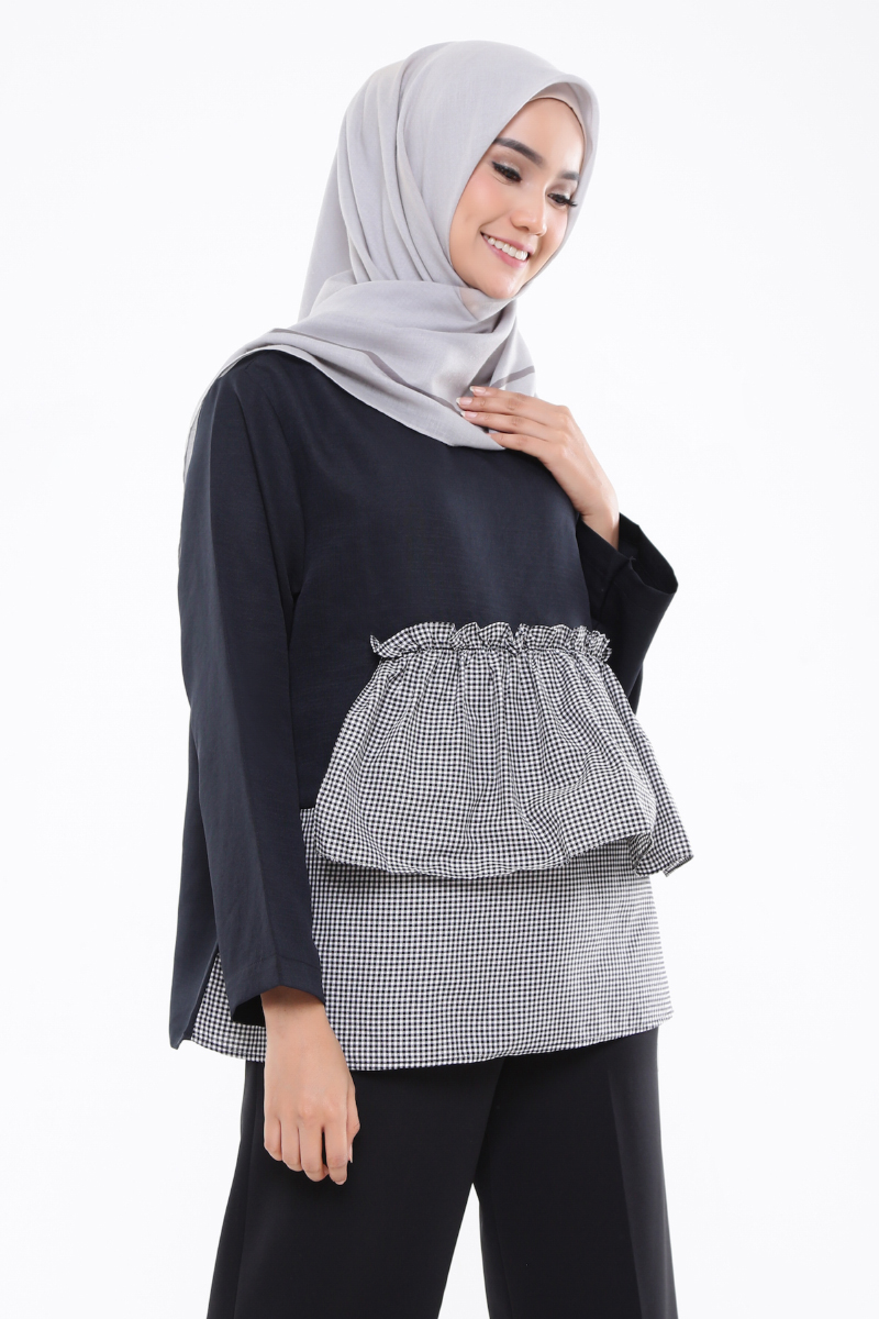 Atasan ruffle hitam bisa dipadankan dengan bawahan apapun. Padu padan atasan hitam dengan kain cokelat ini memberikan kesan etnik yang sangat kental. Lengkapi dengan jilbab motif bernuansa senada dengan bawahanmu.