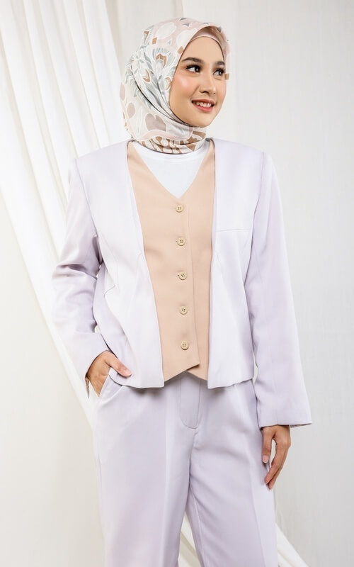 Blazer berwarna liliac ini memiliki kesan feminin dengan sentuhan modern. Blazer-nya tampak menarik dengan potongan kain berwarna kontras, yaitu beige. Potongan blazer yang lurus namun tidak terlalu ketat, membuatnya nyaman dikenakan sepanjang hari.