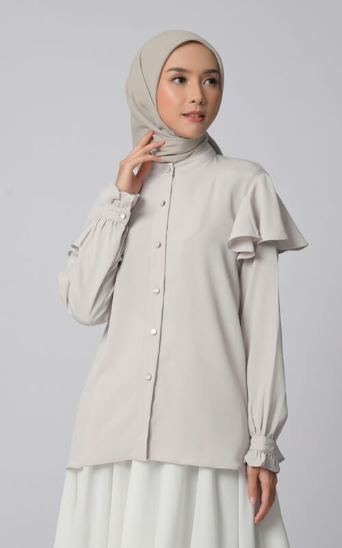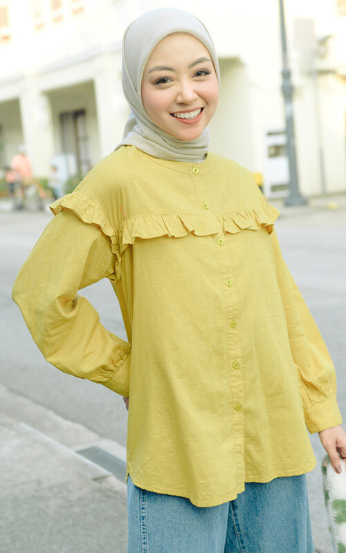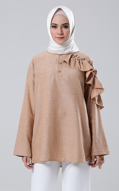 Sentuhan ruffle pada bagian dada membuat kamu tampak berani, namun tetap sopan. Model blus ruffle ini cocok untuk kamu yang berhijab. Detail ruffle membuat kamu tampak lembut dan keibuan.