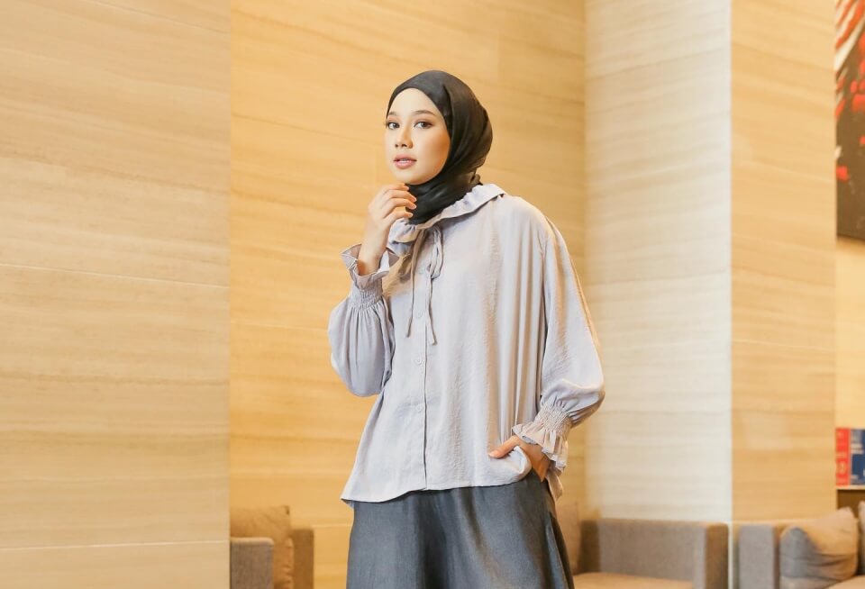 Kamu bisa memadupadankannya dengan celana panjang dan hijab putih agar tampak fresh. Outfit ini cocok untuk segala situasi dan paling pas jika kamu menggunakan makeup agak tebal.
