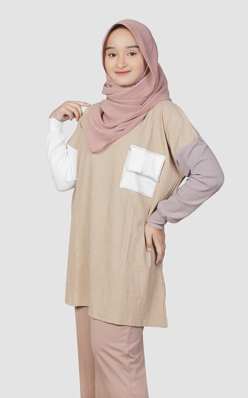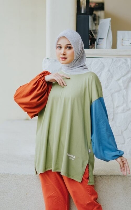 Terbuat dari bahan kaos yang adem bikin blus ini auto nyaman buat hijabers. Potongannya juga longgar, dan semakin catchy dengan lengan panjang model balon yang dibuat beda warna.