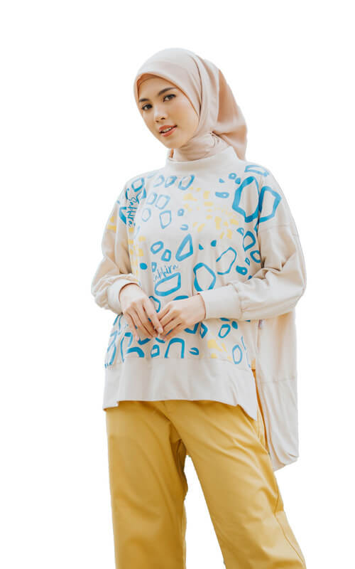 Cocok untuk gaya santai tapi kece saat nongkrong di cafe, baju atasan remaja motif abstrak ini bisa kamu coba. Potongannya oversize dengan model kerah tegak dan potongan belakang lebih panjang dari depan, jadi lebih sopan dan nyaman.
