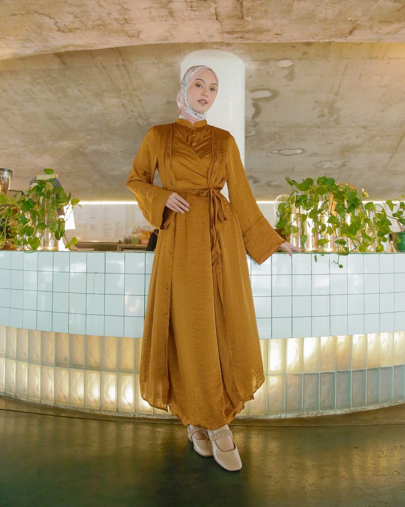 Untuk look ini, kamu bisa memakai dress yang memiliki model wrapped yang bisa memberikan kesan yang elegan dan glamour untuk kamu pakai ke acara formal. Hadir dengan warna brown dan juga bahan zara silk yang tentunya terlihat mewah pada saat dipandang.