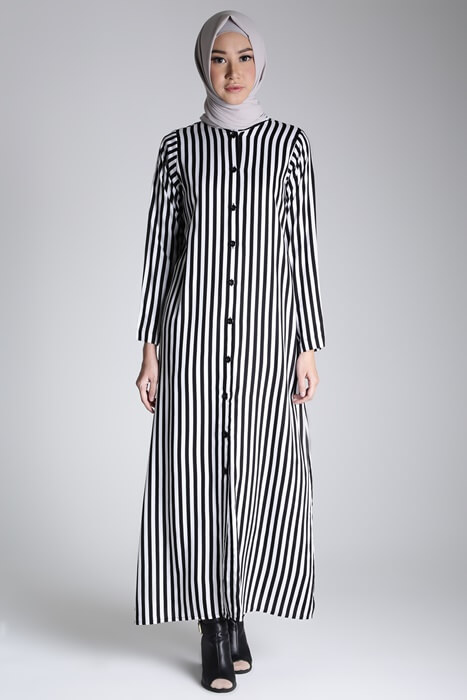 Mungkin hal ini sudah tidak asing lagi bagi para wanita bertubuh pendek. Pemilikih busana muslim bergaris vertikal memang sangat cocok untuk wanita bertubuh pendek. Kuncinya adalah pilihlah busana yang memiliki garis yang tipis (Lihat koleksi busana bergaris di sini). Akan lebih bagus bila motif garis tersebut berwarna hitam, putih, abu-abu, ataupun biru tua. Hal tersebut akan memberikan kesan tubuhmu lebih terlihat tinggi.