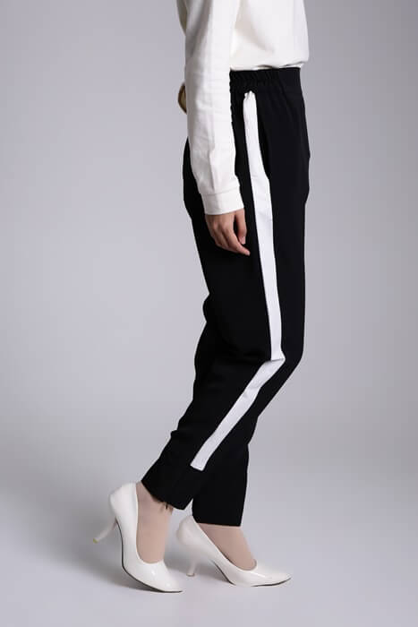 Celana dengan warna hitam memang cocok digunakan disetiap kesempatan. Tidak ada salahnya untuk emncoba menggunakan celana hitam berpotongan fit dengan aksen single stripe putih pada samping celana. Aksen single stripe pada celana akan memberikan kesan kaki yang jenjang sehingga dapat dipadukan dengan busana muslim yang cocok untuk wanita pendek. Temukan pilihan celana lainnya di sini.