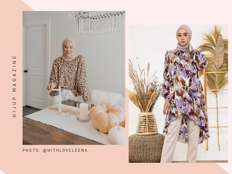 Kalau kamu ingin tampil beda tapi takut terlalu mencolok, coba deh pattern top berwarna cokelat. Kamu bisa memadukannya dengan celana putih dan hijab polos. Tampilanmu akan lebih trendy seperti outfit yang dikenakan Leena ini. Kesan warna cokelat yang membuatnya tetap terlihat kalem tapi pattern dari atasannya membuat Leena terlihat lebih berani dan effortless, kan?