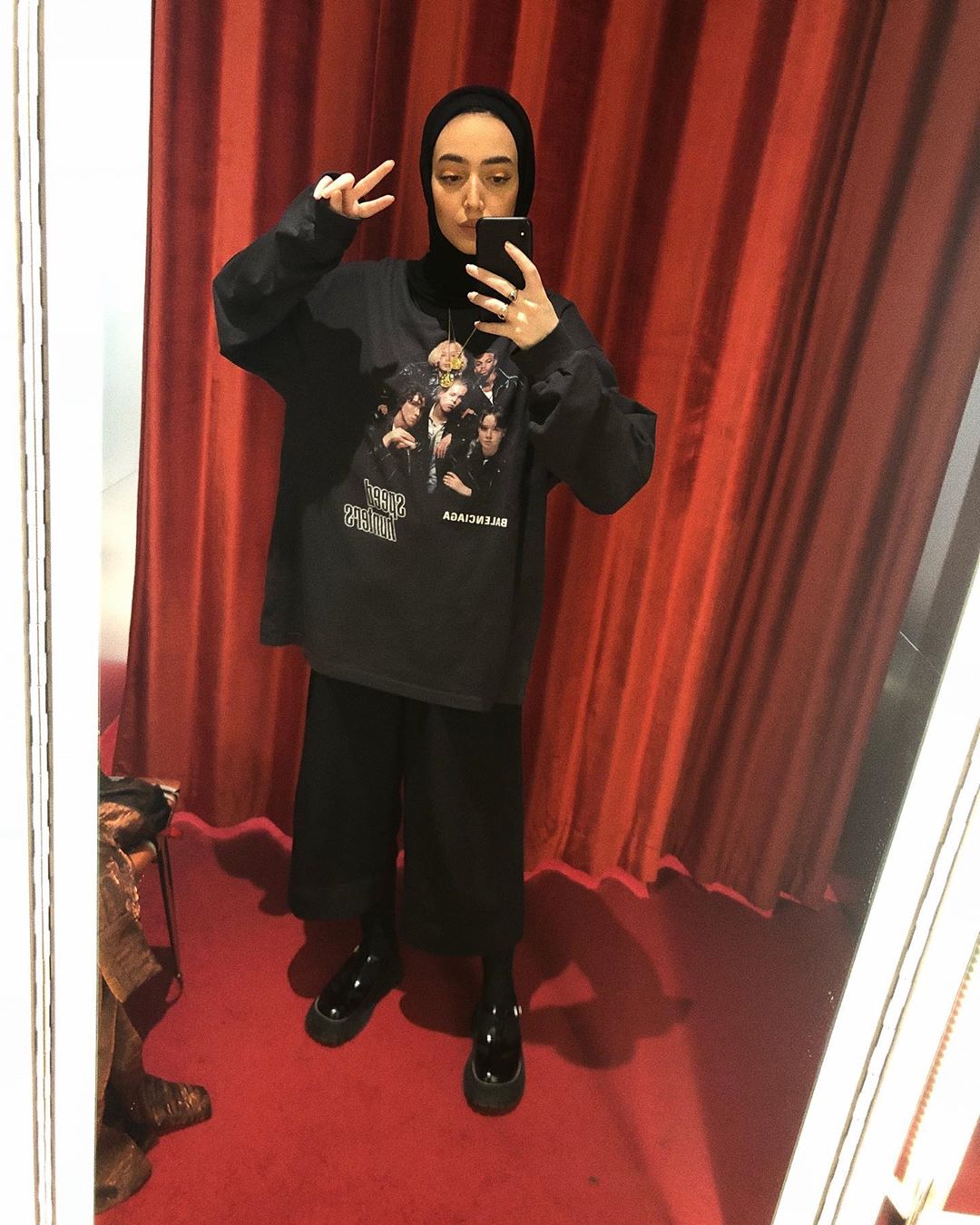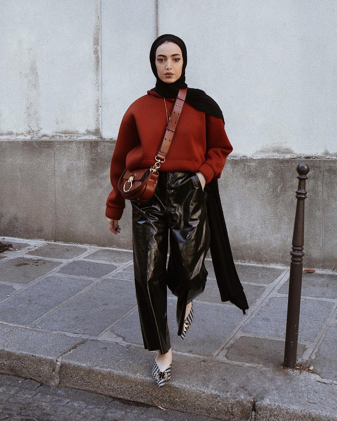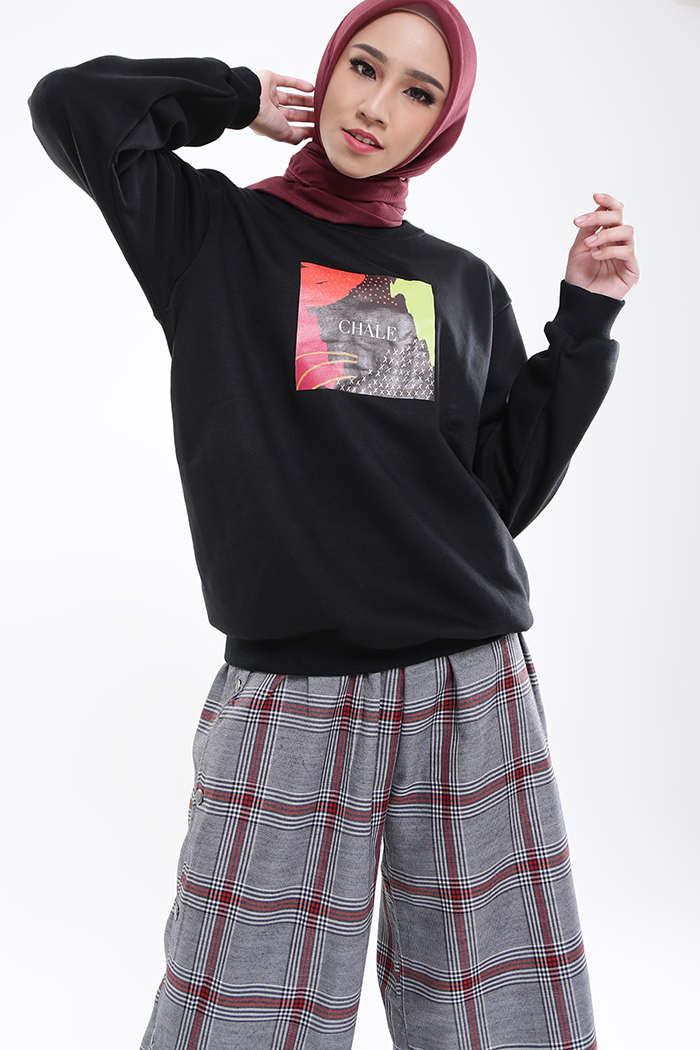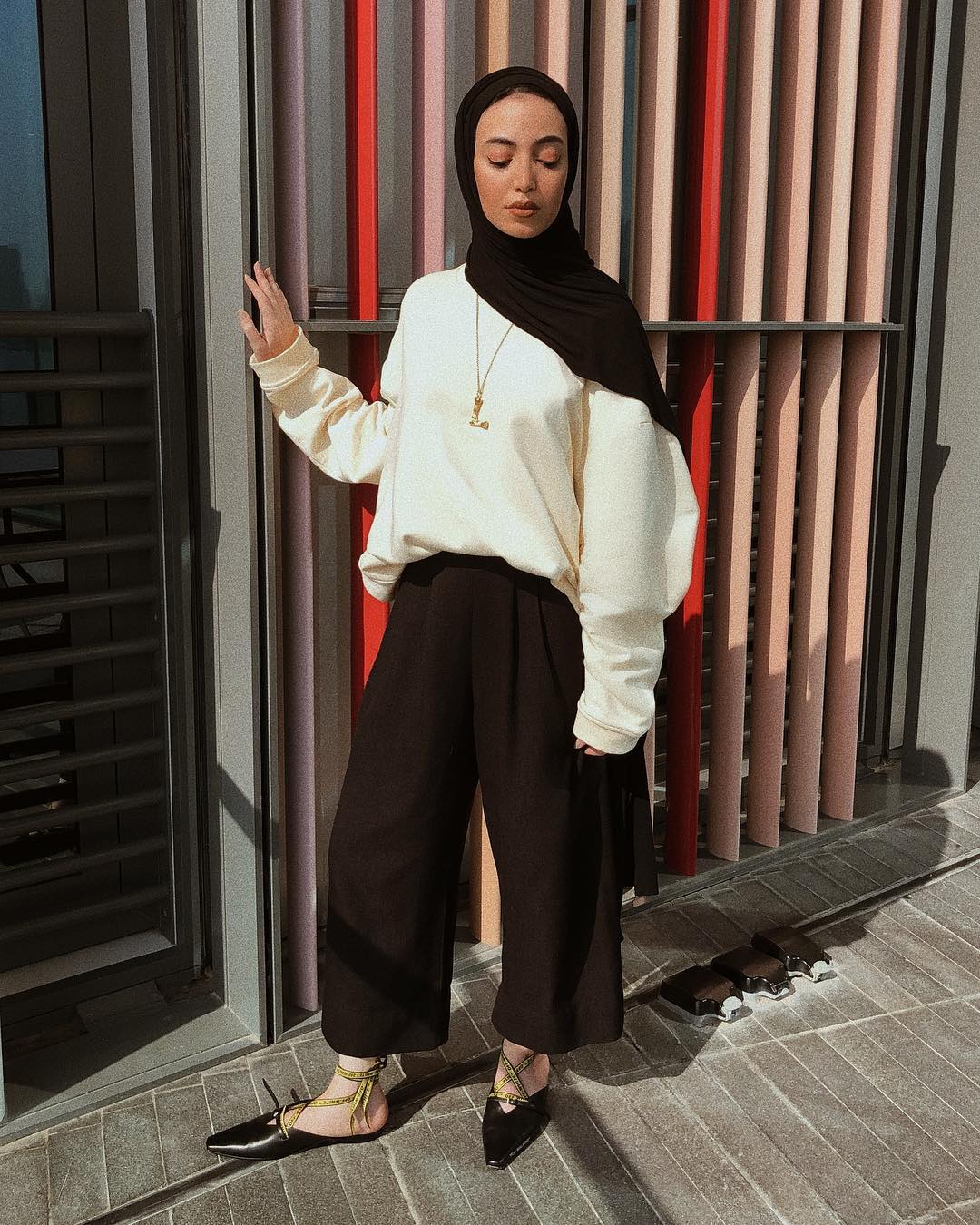 Gaya yang chic bukan pilihanmu saat ini? No need to worries! Celana kulot panjang hitam favoritmu juga cocok untuk padanan gaya yang edgy. Untuk ide padu-padannya, kamu bisa meniru dari gaya Leena yang simpel namun on-point ini. Kenakan sweater print hitam yang senada dengan celana kulot dan pashminanya. Sempurnakan gaya ini dengan kaos kaki hitam panjang dan koleksi sepatu mary-jane shoes.