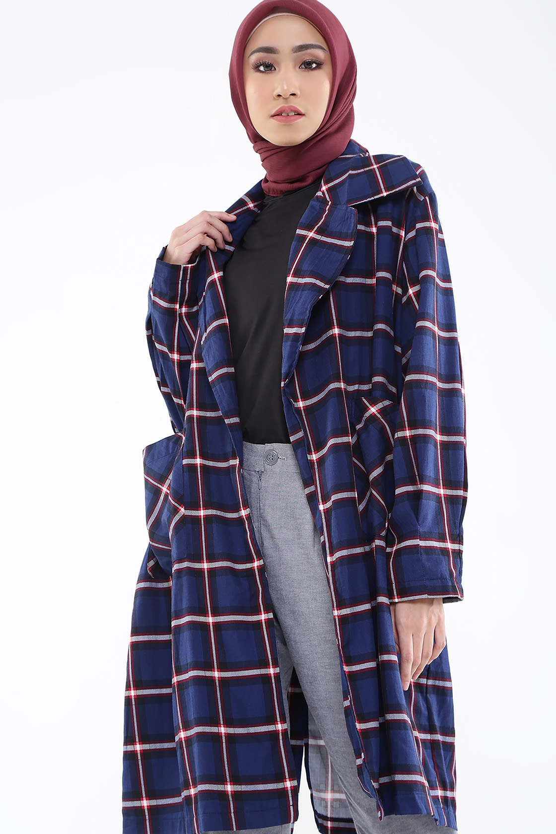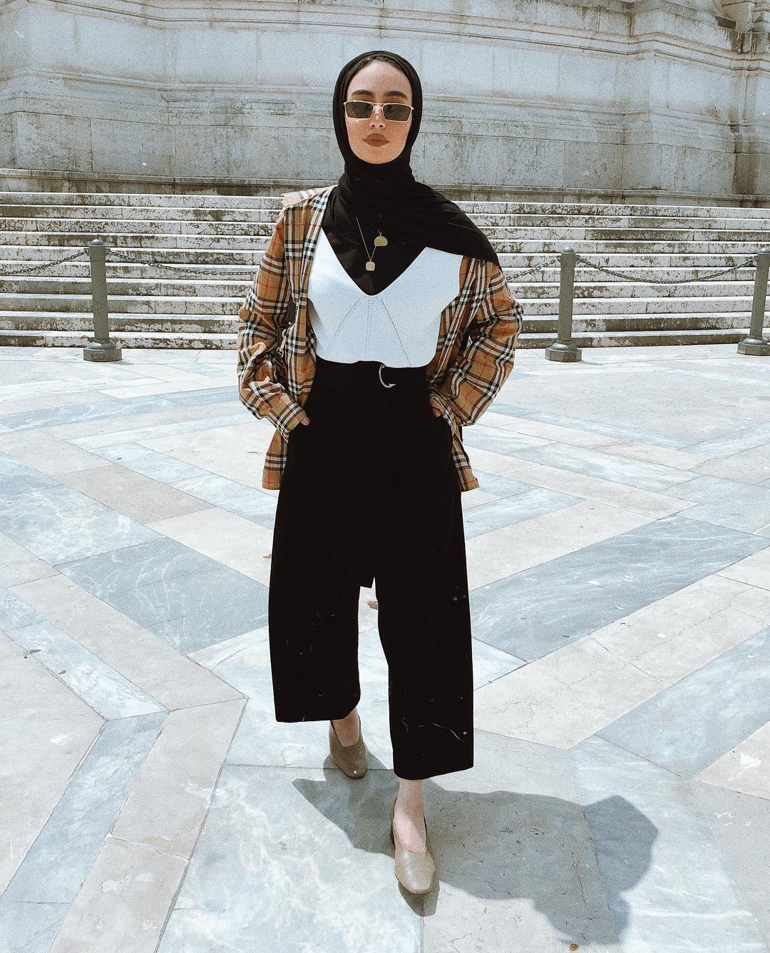 Ingin memasukan kesan atraktif pada tampilan? Salah satu trik gaya yang bisa kamu aplikasikan adalah menggunakan plaid blazer. Untuk ide mix and match-nya, kenakan blouse putih yang dipadukan dengan celana kulot warna hitam dan blazer motif kotak. Lengkapi padanan gaya ini dengan mid-low heels, pashmina, sun glasses, dan kalung panjang.