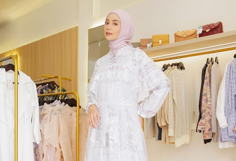 Pas dipadukan dengan jilbab segitiga polos, dress ini tampak ramai dengan tambahan kain brokat dan tile bermotif polkadot. Kalau nggak keberatan untuk pakai baju berlayer banyak, maka dress mewah ini cocok jadi pilihan saat kondangan.