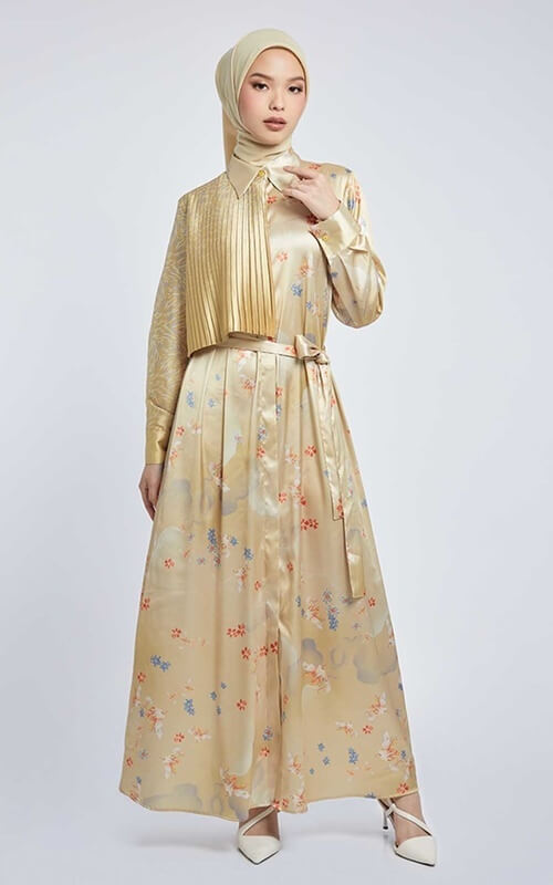 Jika kamu cari gamis premium dengan motif elegan, maka bisa memilih warna-warna mencolok untuk membuat penampilan terlihat mempesona. Dengan menggunakan tema gold, gamis memiliki motif bunga kecil berwarna biru, merah, putih dari bagian bawah sampai bagian atasnya.