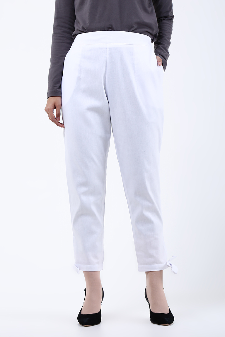 Celana putih berpotongan lurus dengan akses pita di bagian bawahnya ini bisa menambah kesan girly pada gaya liburanmu!